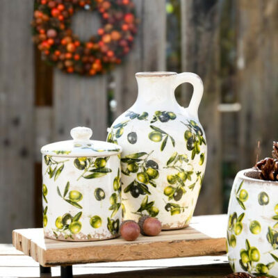 • Cor: Fundo branco com estampado de azeitonas verdes e pretas • Inclui tampa com pega