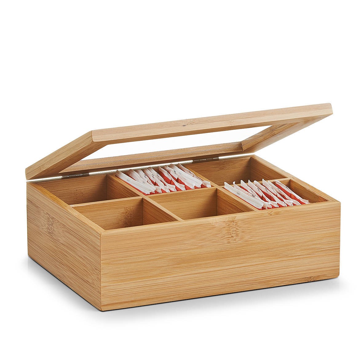 Caixa de chá em bambu com tampa transparente, ideal para organizar saquetas de chá de forma prática, elegante e sempre visível. As seis divisórias internas permitem separar diferentes variedades, mantendo tudo bem arrumado e acessível. Com um design natural e sofisticado, esta peça adapta-se perfeitamente à cozinha, sala ou até a espaços profissionais, oferecendo uma forma bonita e funcional de armazenar as suas infusões favoritas.
