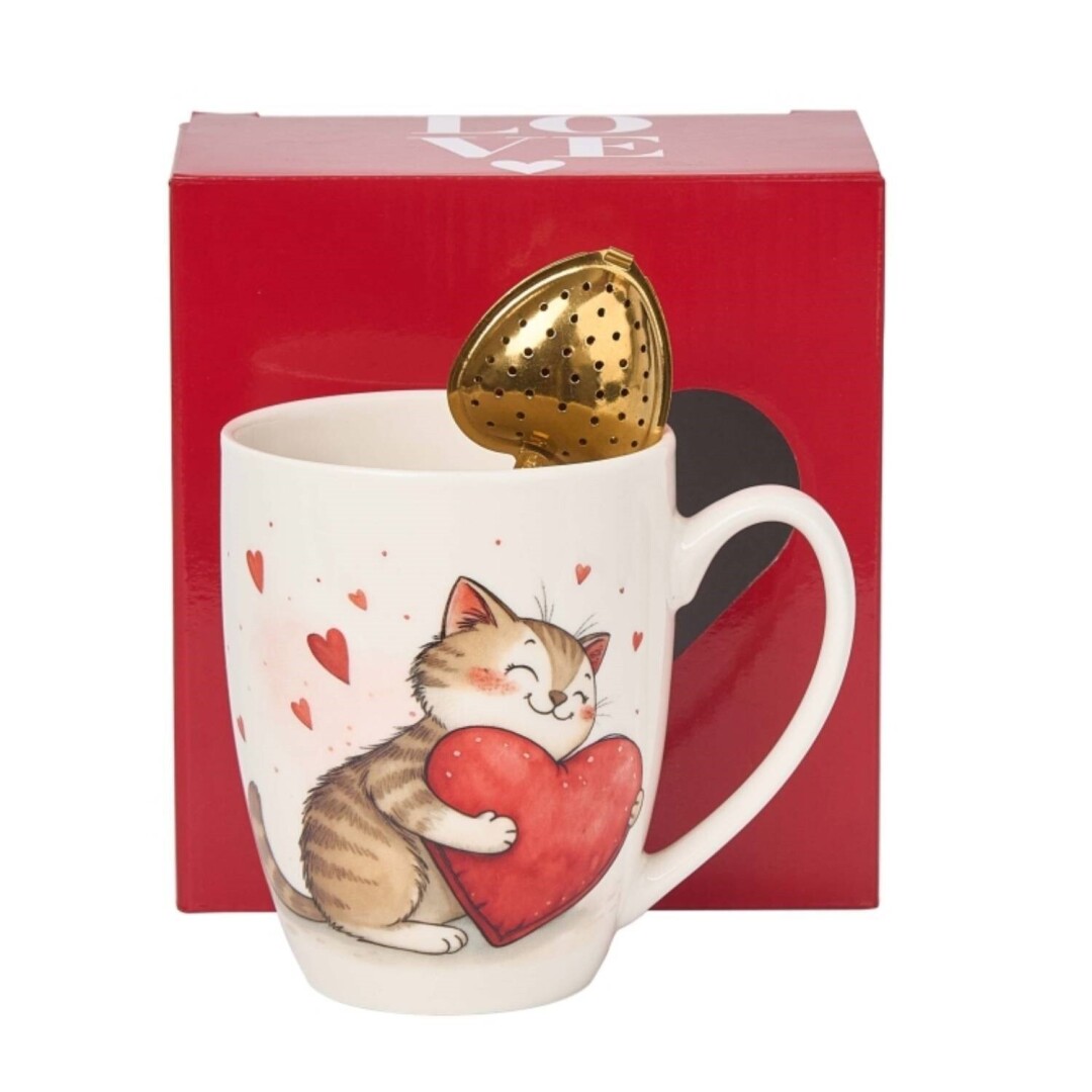 Inclui bola infusora em inox, perfeita para preparar chá ou infusões de forma prática, mantendo todo o sabor. A combinação do desenho amoroso com os detalhes cuidados torna esta caneca uma excelente sugestão de presente, especialmente para amantes de gatos e de peças cheias de ternura.