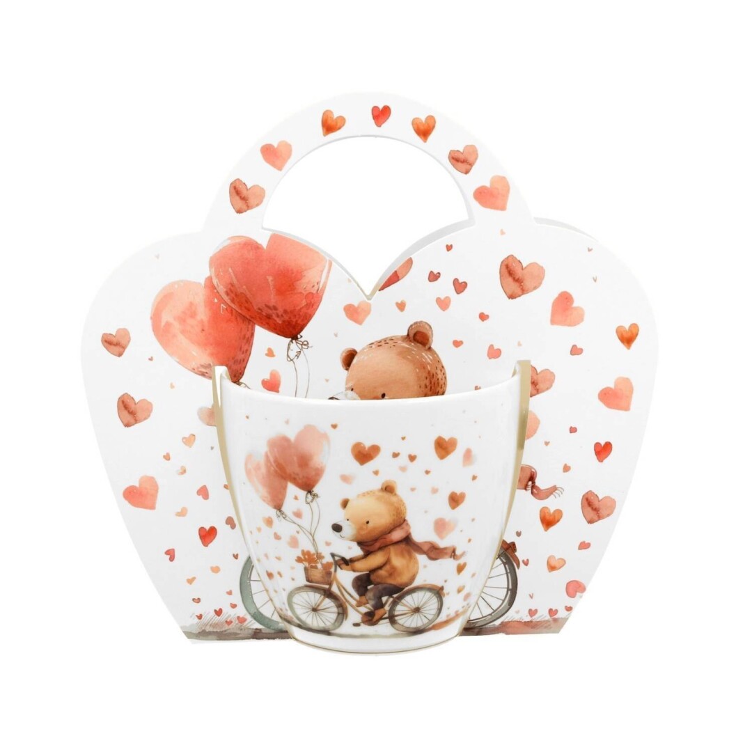 Caneca em porcelana decorada com um delicado desenho de um ursinho a andar de bicicleta, rodeado por corações em tons suaves de rosa e vermelho. O design doce e romântico torna esta peça perfeita para momentos de pausa cheios de carinho.