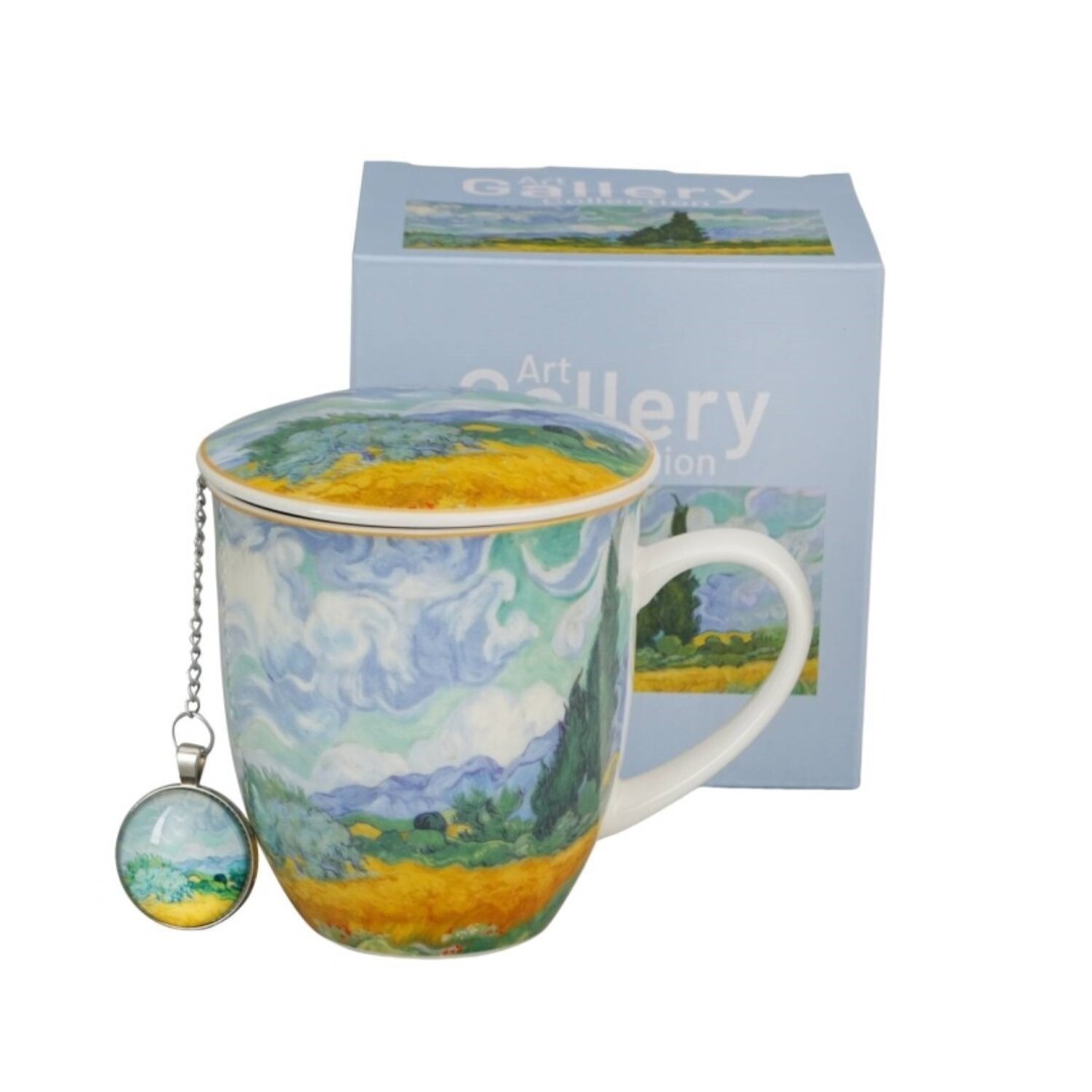 Caneca de infusão em porcelana inspirada nas paisagens campestres de Van Gogh, com um design artístico que transmite tranquilidade e beleza natural. Inclui filtro em inox e tampa em porcelana, ideais para preparar chá ou infusões de forma prática e elegante.