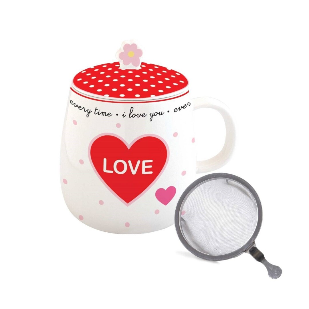 Caneca em cerâmica decorada com motivo de coração e a palavra “Love”, ideal para momentos de pausa cheios de carinho. Inclui tampa e infusor em inox, perfeita para preparar chá ou infusões de forma prática e elegante.