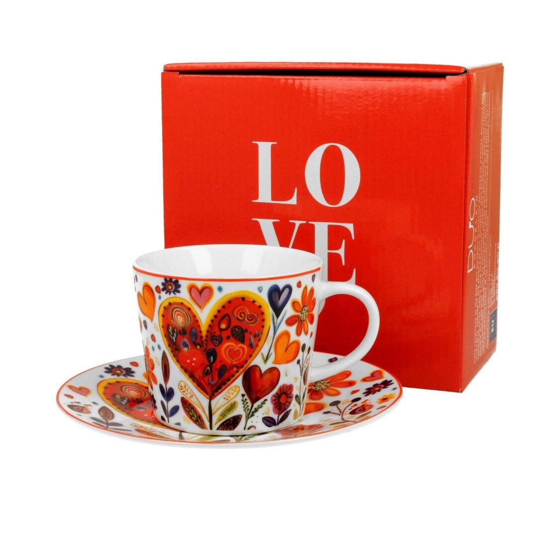 Chávena de chá em porcelana, com padrão de corações e pires a condizer. Um conjunto delicado, ideal para momentos de pausa e para quem aprecia pequenos rituais do dia a dia.
