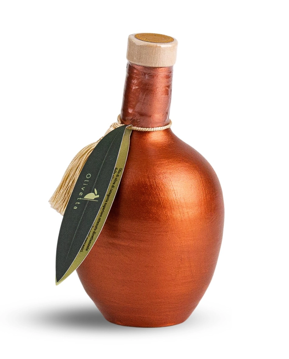 No interior, encontra-se um azeite virgem extra italiano, obtido a partir de azeitonas da variedade Coratina, reconhecida pelo seu carácter intenso, notas frutadas e ligeiramente picantes, típico do sul de Itália.