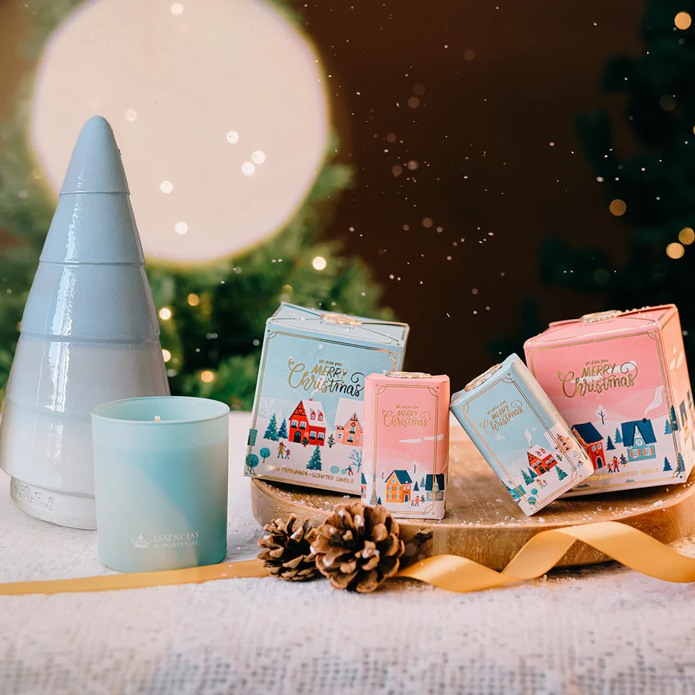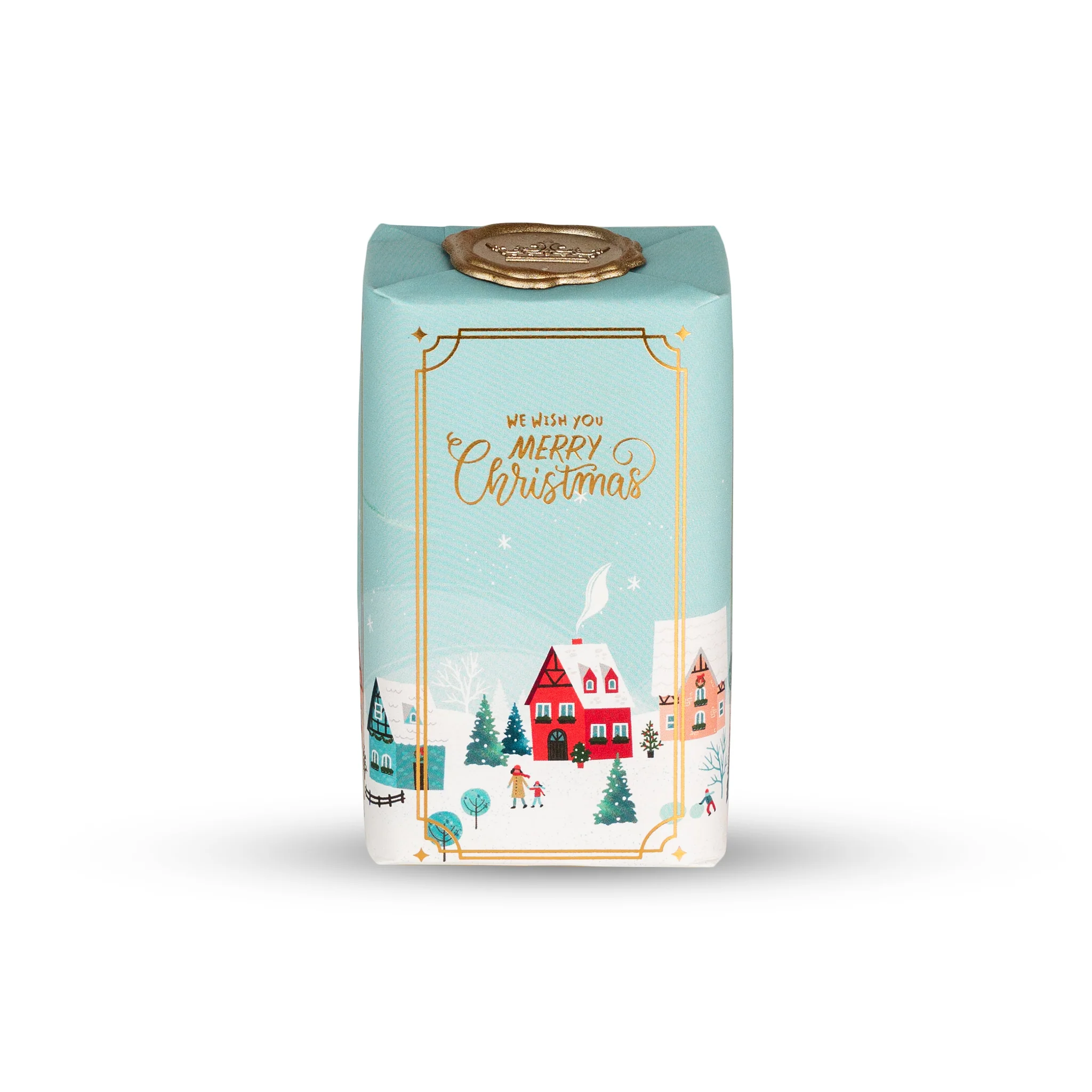 A embalagem ilustrada com aldeias nevadas, selada com um lacre dourado, evoca o encanto das tradições natalícias e torna este sabonete um presente especial — perfeito para oferecer ou para transformar o seu ritual diário num instante de paz e aconchego.